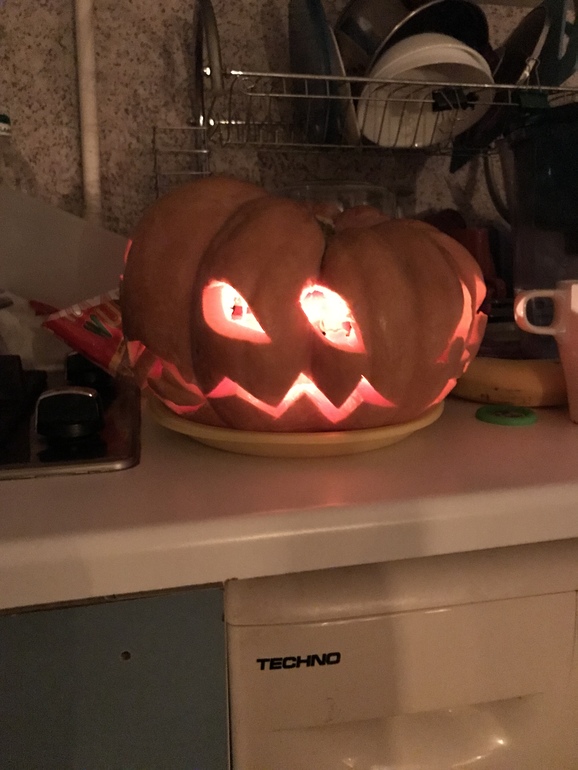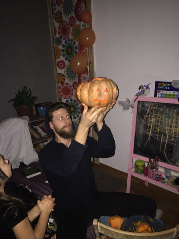 Духи остались довольны стараниями детей и отдали им тыкву, которую до этого похитили. И тут на сцену выступил папа Витя со своими золотыми руками. А! Еще до получения тыквы, дети рисовали каждый свой проект рожицы для нее. Лучший должен был быть воплощен в тыкве.