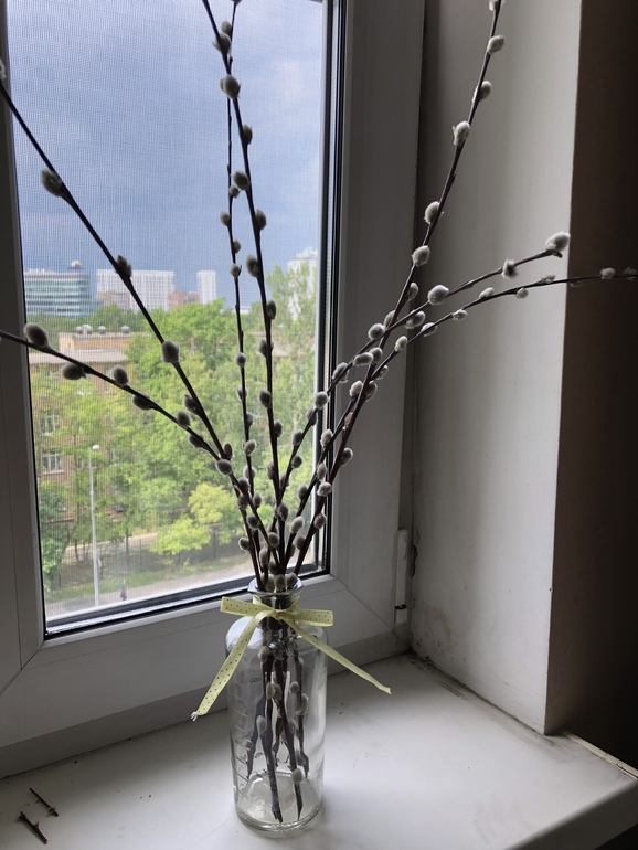 Платик сидит обрывает почки с вербных веточек. Потом сидит играет ими. Я говорю ему: пушистики. А он отвечает: это маленькие заячьи хвостики, мама