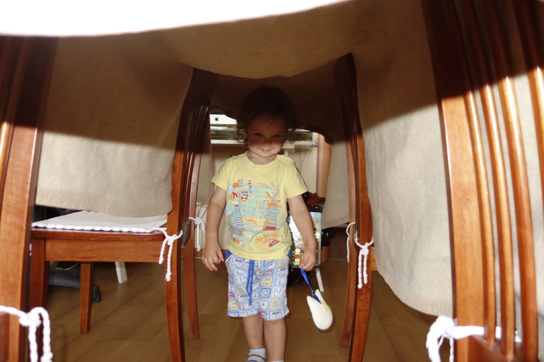 Построила я тут давеча конструкцию из стульев и одеял. Задумывалась она как туннель. предполагалось, что мы с Лукой будем ползать по нему.