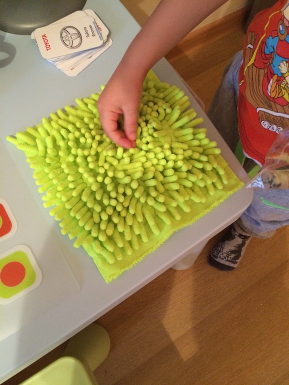 С утра Лукеня с насекомыми решил поиграть. Я ему предложила поселить их в траву. Под видом травы подсунула ему тряпку из фикс прайса