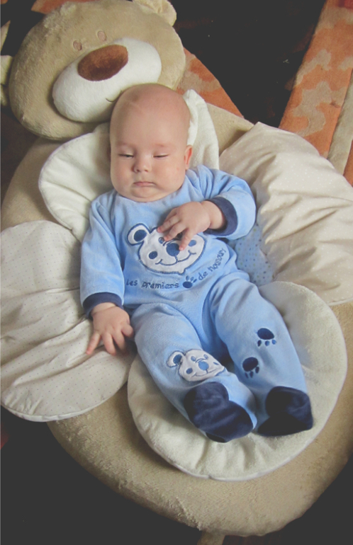КостенькаНаконец то мишка, которого свекровь по заказу моему на рождение Кости покупала в Mothercare, стал Косте по размеру, раньше приходилось подушку подкладывать, теперь уже нет :))