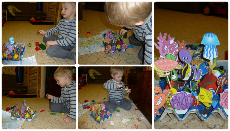 Когда высохла (после сна) продолжили. Решили заселить туда живность. (Я распечатала и наклеила на картон океаническую живность и кораллы). Но как их разместить? А давай приклеим на зубочистки. Идея понравилась, стал пытаться сам что-то скотчем мастрячить.