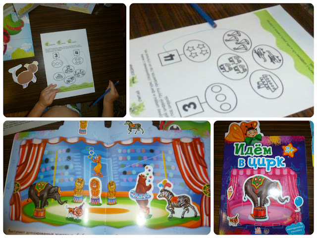Но нам нужен билет - надо правильно соединить количество и цифры. Сделали - билет есть. Я достала из закромов родины книжку с наклейками про цирк. Она 2+, так что я была уверена, что мы ее переросли и не будем использовать, но она пришлась по случаю. Почитали, наклеили наклейки в нужные места.
