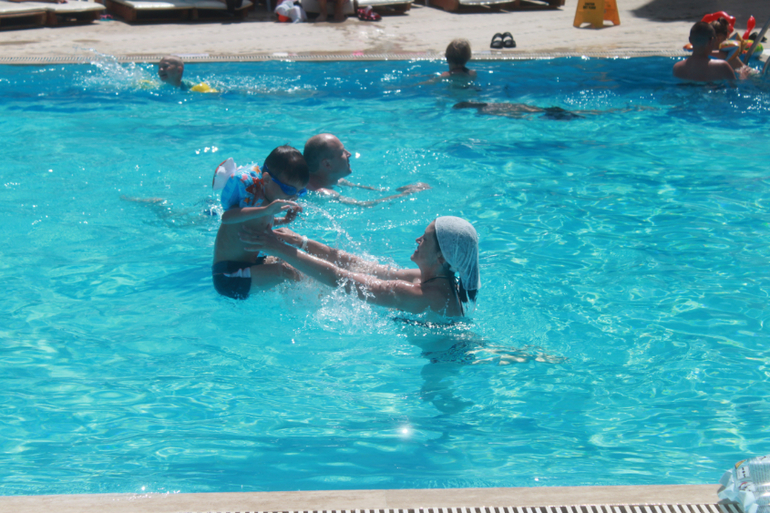 Не большой, но очень уютный отельчик. Атмосфера какая то домашняя, очень приятно. Море находится через дорогу, из отеля на пляж туннель. Два взрослых бассейна и один детский. Две не большие горки. Номер был стандарт, НО! разделен перегородкой на две части, и во второй части стоит диван. Очень удобно и здорово. Для Пашика принесли кровать-манеж. Кормили хорошо. Иногда младшему давала суп-пюре (если не острый был), очень понравился кукурузный! прям до скандала: давай еще! В ресторане стульчики для кормления были всегда. Вообще поесть можно было всегда, между завтраком-обедом-ужином возле бассейна картошка фри, гамбургеры, овощи, жареные булочки с начинками (сыр, колбаса), к вечеру печенье, вафли, бисквит. Анимация была, детскую видели, взрослую нет, уходили спать. Вообще не довольных не видели, с детьми очень много отдыхающих. Единственный минус, который нас чуть огорчил, это отсутствие съездов для колясок, в отеле много ступеней и приходилось либо таскать коляску на себе, либо оставлять её и идти с ребенком на руках.