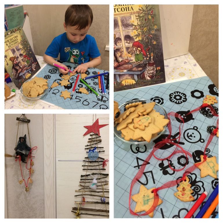 Пёс спасает Новый год , квест с КУМ 2017 годКвест прошли сегодня быстро. Киндер сюрпризы мы не едим с некоторого времени, и вместо него на елке появилась рафаэлка с подсказкой, шифр поменяла на тумбу, т.к. Книжной полки у нас нет. Отгадал, посчитал птиц. И наконец нашёл книгу. И мы поехали в сказку. Помогли Петсону помыли пол. Нарядили елку. А наряжали мы ее так. Помните задание со снеговиками? Нам тогда игра понравилась. А сегодня мы не зачёркивали цифры, а клеили на них наклейки, наряжали типа-))). Кто быстрее, тот победил.-))) Кир был последним, и тутже изменил правила, кто последний- победил.😂 позже мы пекли пряники и раскрасили их, часть пустили на гирлянду. Но на елку не повесили, т. К. Она из веток у нас все таки, которые мы насобирали с земли, а сладкоежки обязательно схомячат прянички, решили не рисковать. А нарядили мы бабу ягу, она у нас рядом с елочкой сидит. Ну и у неё праздник будет. А дальше мы танцевали. И ещё сегодня придя с шахмат сообщил мне, о том что сумел пешку превратить в Ферзя.