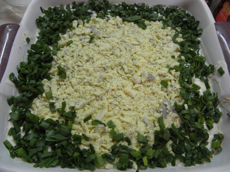 Каждый слой салата следует промазать заправкой и украсить яичным желтком и зеленым луком по своему вкусу