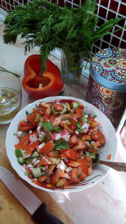 Овощи помыть, нарезать достаточно крупно, добавить нарезанные крабовые палочки, зелень, оливки, порезанные на 4 части, при необходимости посолит и заправить кефиром. Я люблю есть это салат без заправки или чуть сбрызнув лимонным соком.