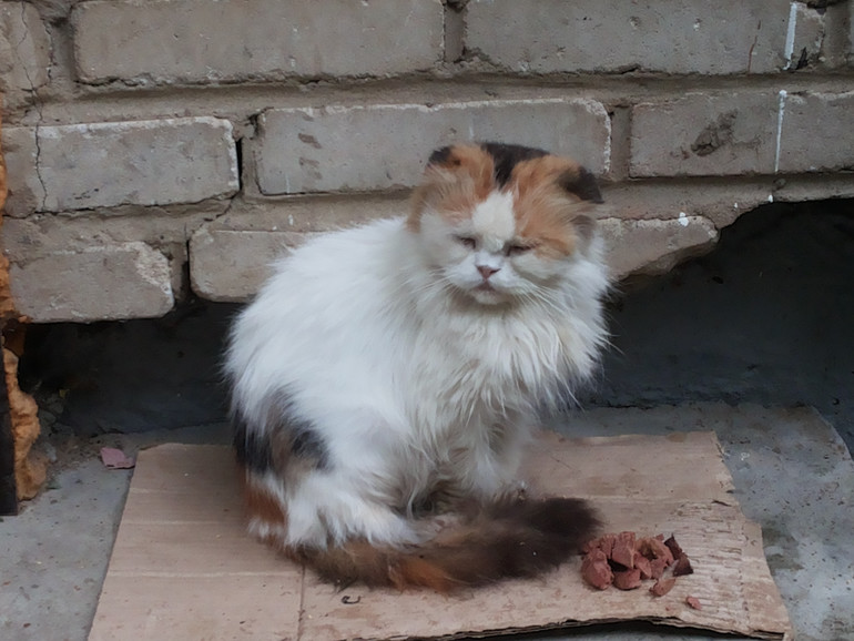 Вот такую красавицу обнаружила на картонке у подъезда. Видно, что была домашняя, но выбросили. Очень ласковая и не убегает, если погладить...готова "забодать" вашу руку))) Не спорит с другими дворовыми кошками, видимо просто не умеет за себя постоять. Поэтому тихо сидит или спит, свернувшись комочком. Уже неделю хожу за 1,5 км ее кормить, скоро уезжаю из города и боюсь она погибнет...