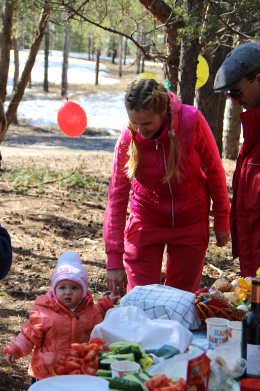 Ежемесячный отчетКатин год выпал на Пасху, как всем известно) А Пасху мы обычно отмечаем на природе, и на этот раз мы решили не нарушать традицию. Тем более, погода была отменная)) Намариновали вкусного-превкусного шашлыка, назвали гостей (по минимуму, только близкие) и отправились на целый день в лес (он у нас прям за домом). Кате было комфортно, она спала, ела (грудь в основном), играла. Из развлечений у меня была викторина- вопросы про Катю. Еще я сделала альбом "первый год жизни", где собрала Катины фотки по месяцам. И оформила журнальными вырезками. Получилось забавно, мило, местами очень смешно)) И еще мы делали видео. Гости смотрели его на планшете. С видео тоже отдельная история. У меня совершенно котелок не варил, что придумать) А моя сестра (Катина крестная по совмесТИТЕльству) познакомилась с мальчиком, который просто по-любительски монтирует видосы. И я попросила Аришку попросить его помочь. Короче, я передала ему все видео за год (а их около 30 гигов). Он был в шоке))) Но он так загорелся, что аж в школу не пошел и целый день смотрел все видео)) В итоге получилось очень даже трогательно, а если учесть, что делал человек, который КАтю совсем не знает, то вообще супер)))