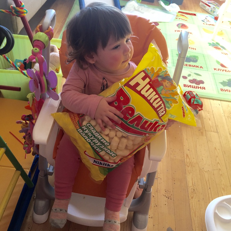 Подсела на бублики и кукурузные палочки, научилась залазить на стулья, чтобы иметь безграничный доступ.
