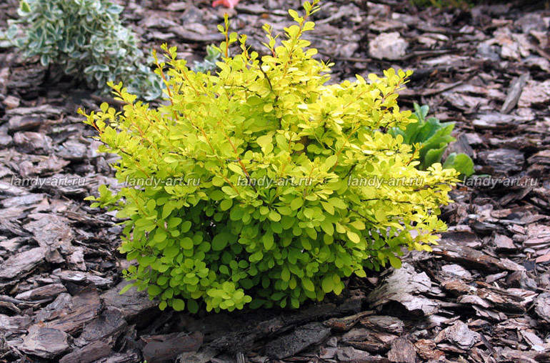 Высота 0,9-1 м, диаметр кроны до 1,2 м. Ежегодный прирост в высоту 4-5 см, в ширину 6-8 см. Крона густая. Листья длиной 1,5-2 см яйцевидные лимонно-желтые, осенью желто-оранжевые. Цветение в мае, цветки желто-красные диаметром до 1 см собраны в кистевидные соцветия. Плоды ярко-красные блестящие размером до 1 см созревают в сентябре-октябре. К почвам нетребователен, засухоустойчив. Используется как ординар, в группах, бордюрах, альпинариях. Зона: 6.