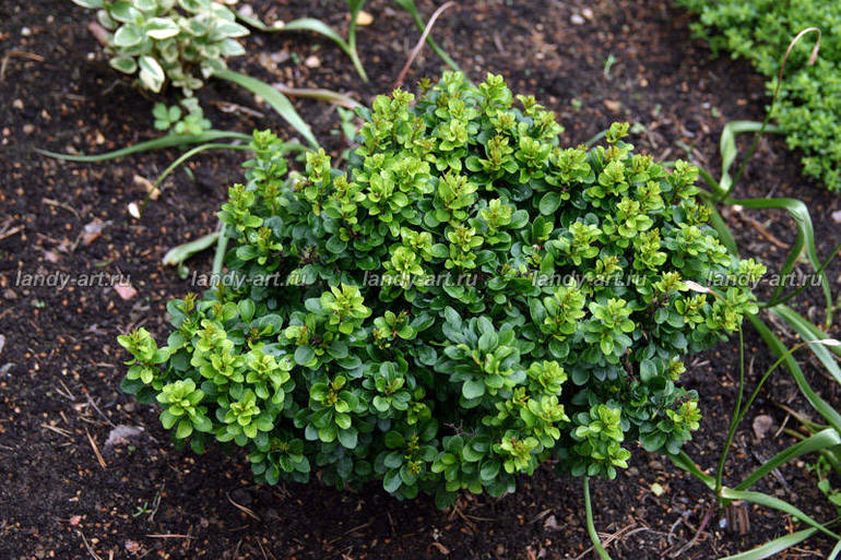 Высота и диаметр кроны до 0,5 м. Ежегодный прирост в высоту и ширину 2-3 см. Крона густая. Листья длиной 1-1.5 см яйцевидные темно-зеленые блестящие, осенью желто-красные. Цветение в мае, цветки желто-красные диаметром до 1 см собраны в кистевидные соцветия. Плоды ярко-красные блестящие размером до 1 см созревают в сентябре-октябре. К почвам нетребователен, засухоустойчив. Используется как ординар, в группах, бордюрах, альпинариях. Зона: 5а.