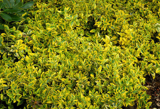 Бересклет Форчуна представляет собой очень оригинальный стелющийся вечнозеленый кустарник с пестрыми желтыми окаемочками на листьях.