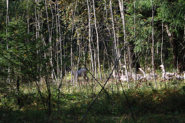 Это конечно не дикие лесные кабаны козы, просто совсем рядом забор дачный. Там-то козы и живут, а с ними и чёрные куры с петухом и стадо (или стая) гусей. А коз хозяин выгуливал. Тимка их испугался, пришлось взять его на руки)). Мы одновременно с дядькой подошли к его хозяйству, а он выпустил всех гусей, хорошо им было не до нас))). Очень их боюсь, кусаются. Они такой ровной шеренгой (гуськом) ломались к лесному прудику плавать и щипать травку.
