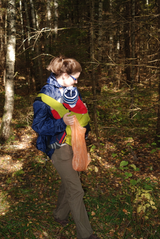 Вот это уже другой день и другой лес. Подосиновиков за час набрали на сковородку)). Мням! Больше нам и не надо)). Тимка хоть и поднывал изредка "хочу домой", но в целом нормально прошлись. Киря в слипе вообще отлично сидел, покушал на привале, пока брат с папой подосиновики срезали, потом уснул. Ветки только конечно опасные, да и опасность что мама споткнется и таки упадет, но все обошлось.