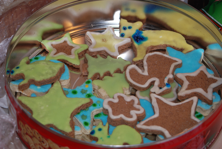 Их можно напечь заранее, они хорошо хранятся в железных баночках. Их и подарить можно, и на елку повесить. Как-то раз мы вешали имбирные пряники из Икеи. Потом с подружкой их снимали и с лимончелло, мм))).