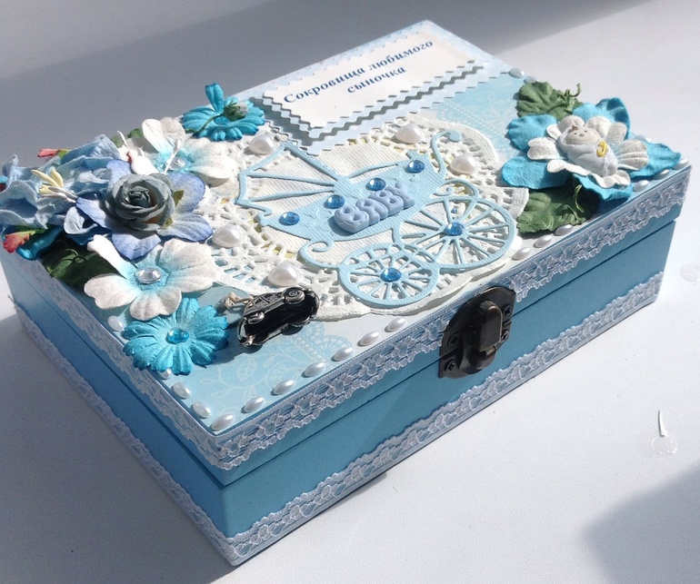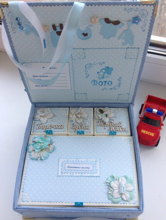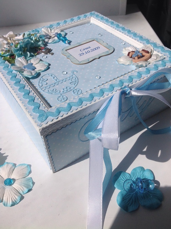 Ура!!!! Свершилось!!! Катерина, ваша шкатулочка готова!!! Я очень благодарна вам за ожидание!!! Если что не так, пишите!!! :) На этот раз вместо декоративной бутылочки у меня маленькая коробочка, просто нет пока их в продаже... :( Коробочка малюсенькая, надпись не вошла, а украсить ее хоть маленько очень хотелось! А так все на месте-пакетик для первого срезанного локона Сашеньки и ленточка для бирочки из роддома тоже есть... Ну вот собственно, фото ниже :)