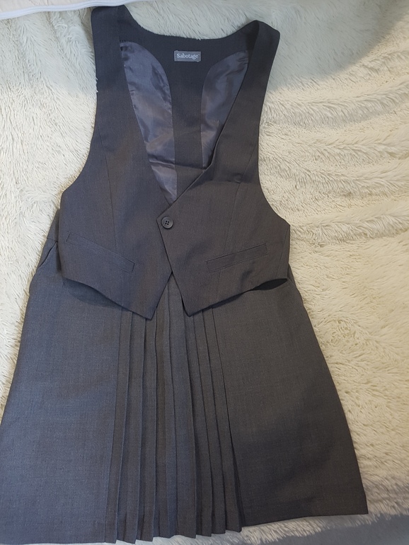 Костюм для девочки, юбка и жилет, на подкладе, костюмная ткань, цвет серый. Бу пару раз, состояние нового. Размер 40, подойдет и на стройную маму.