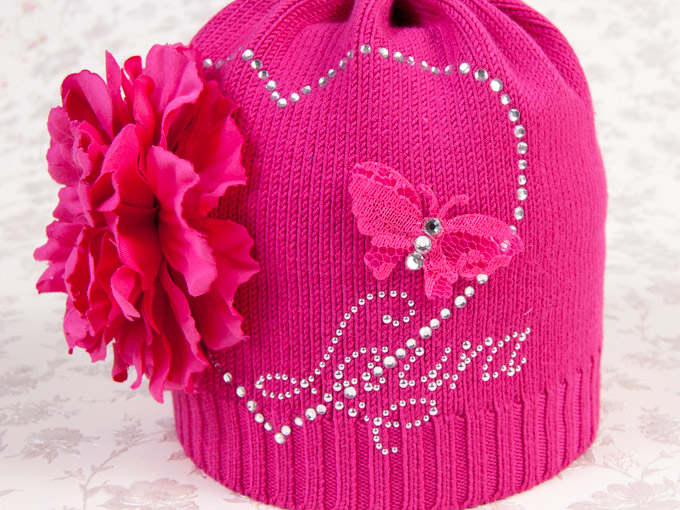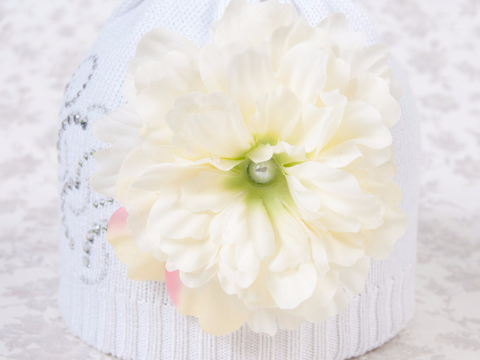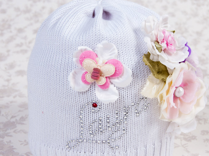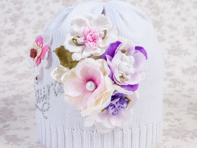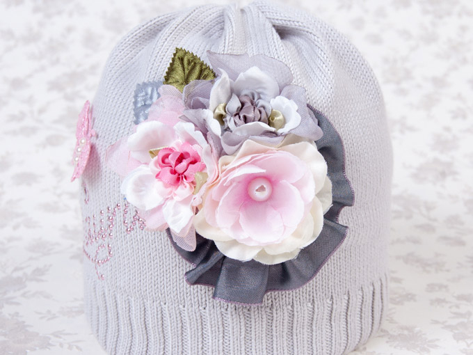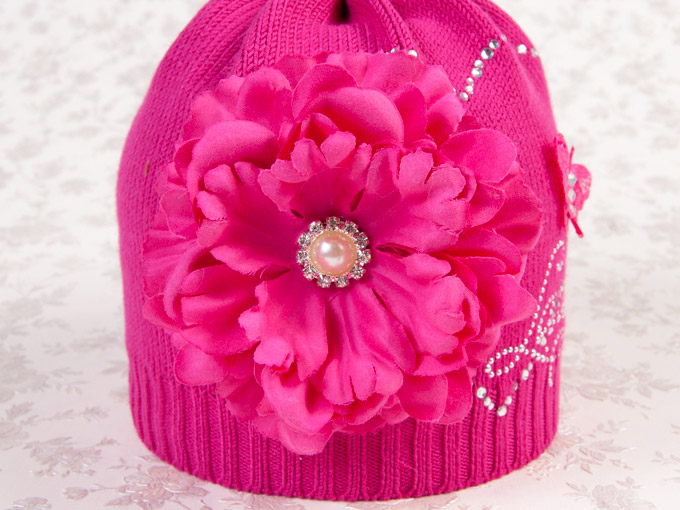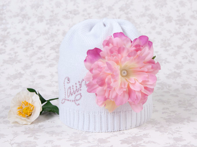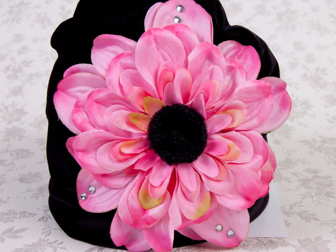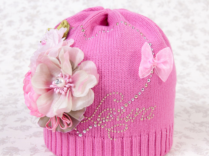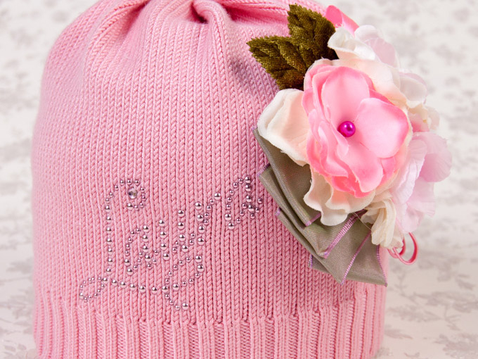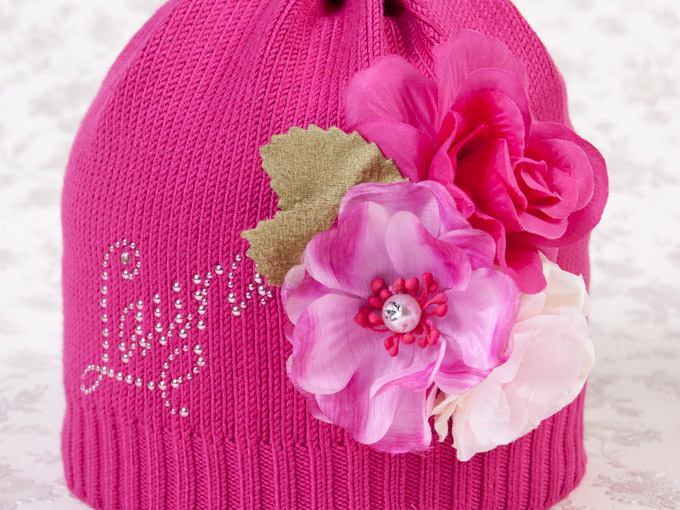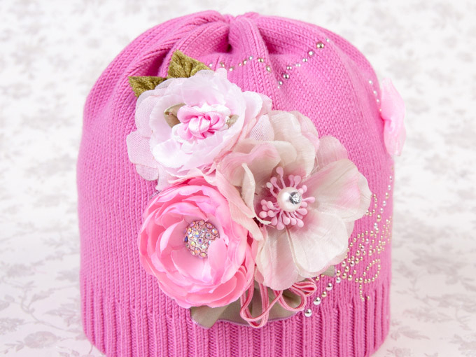 Шапочка украшена большим ярко-розовым цветком в горошек.