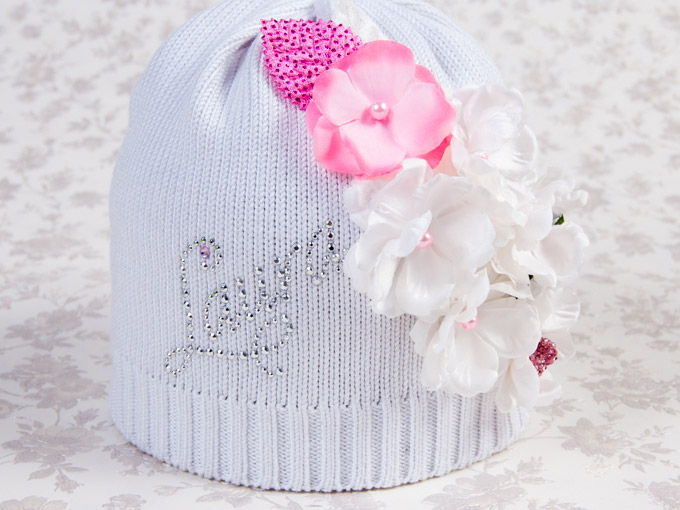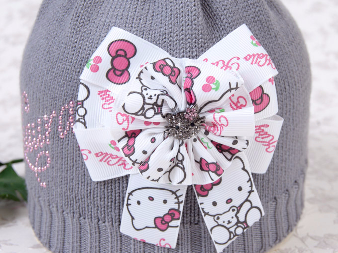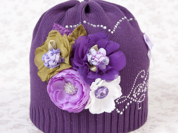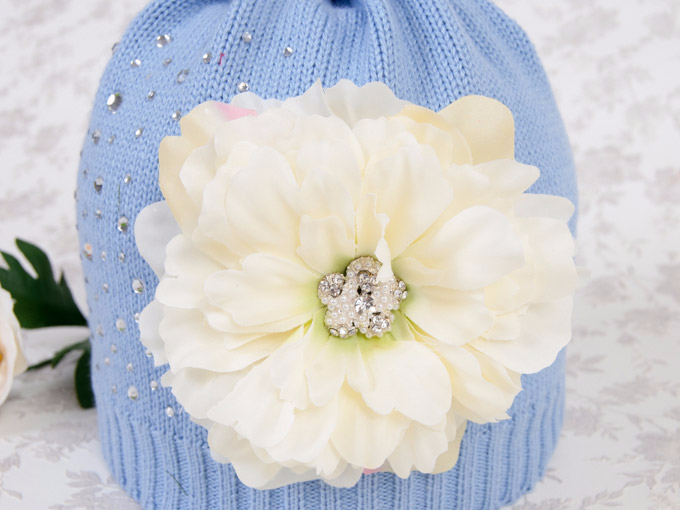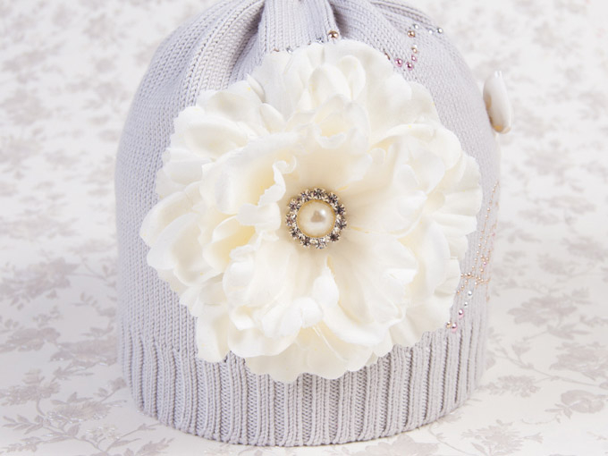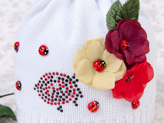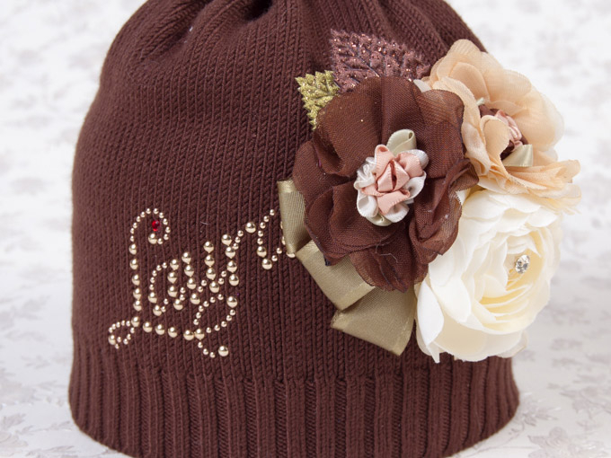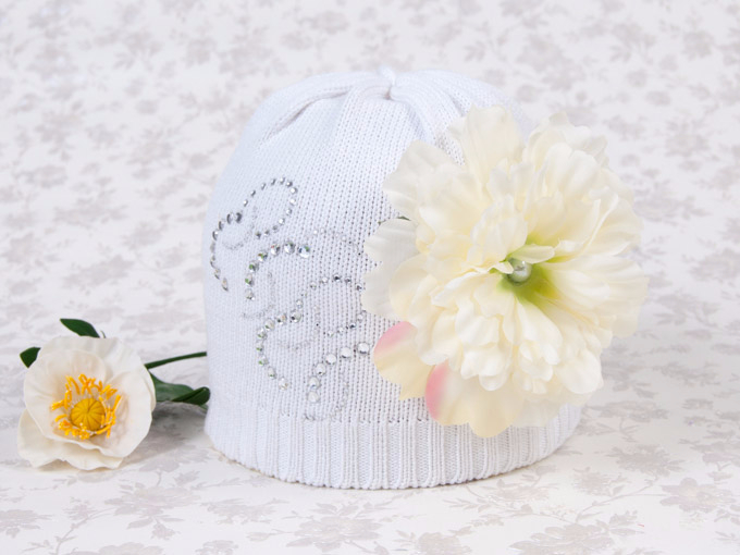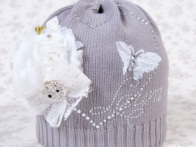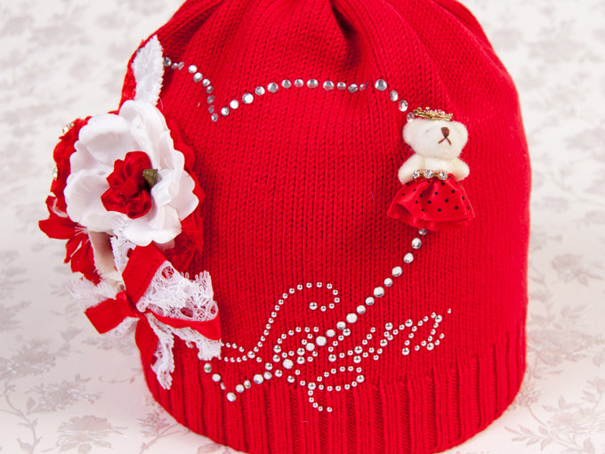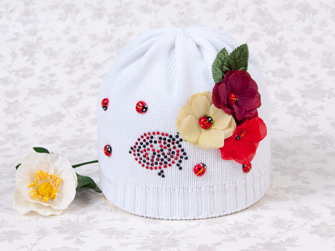 Шапочка украшена большим ярко-розовым цветком в горошек.