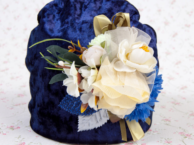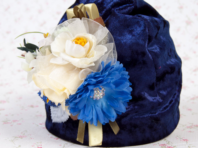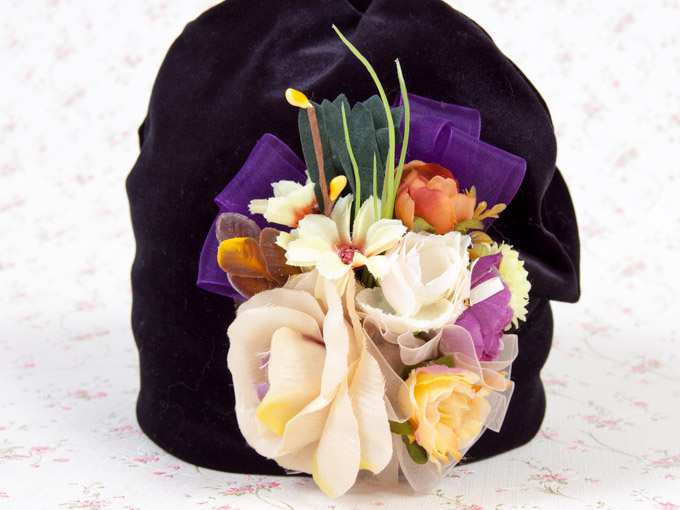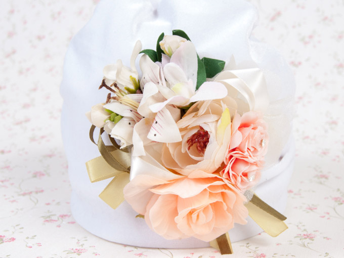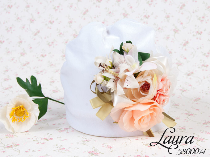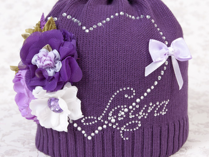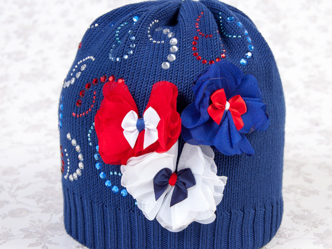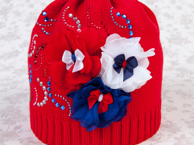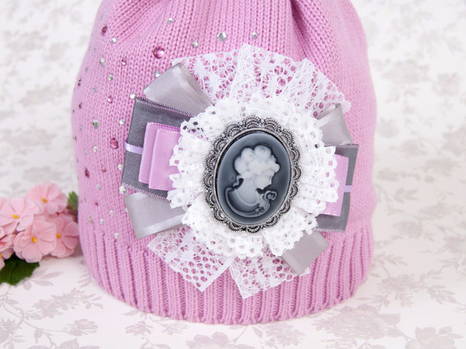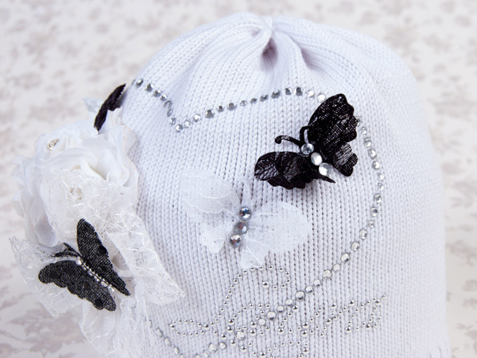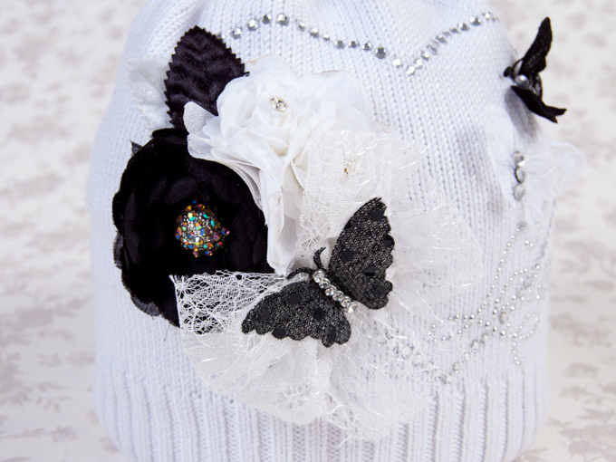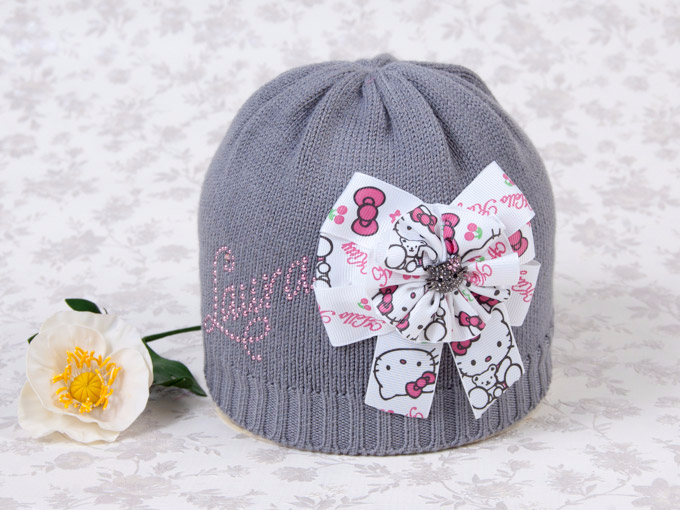 Шапочка украшена большим ярко-розовым цветком в горошек.