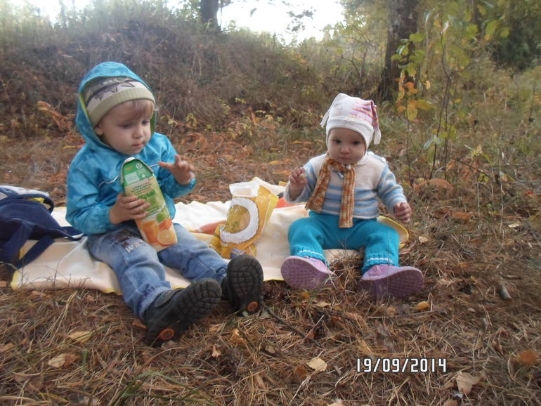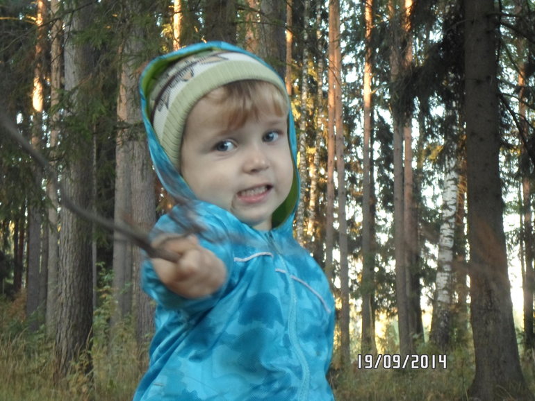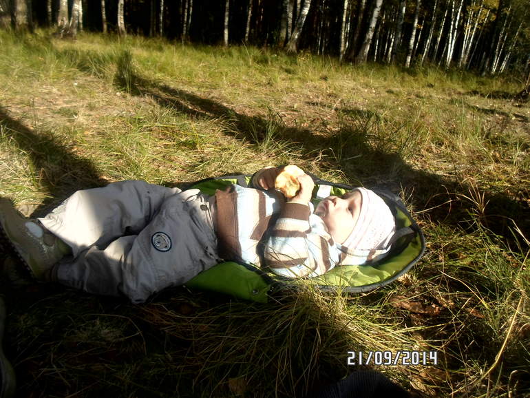 наш поход повторился в конце лета с племянником Тимофеем, правда он всё дорогу настойчиво предлагал мне вернуться обратно домой и переживал, что мы заблудились. Мв поели бутербродов, попили сока, повозились. Веста уснула и мы побрели домой. Тимофей принёс из леса 3 импровизированных палки-меча для защиты от Бабы яги и Змея горыныча