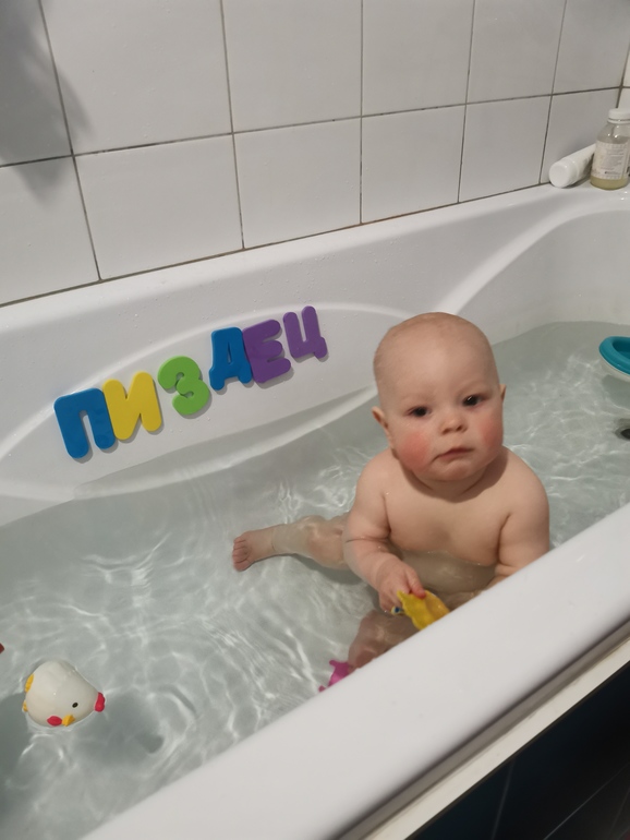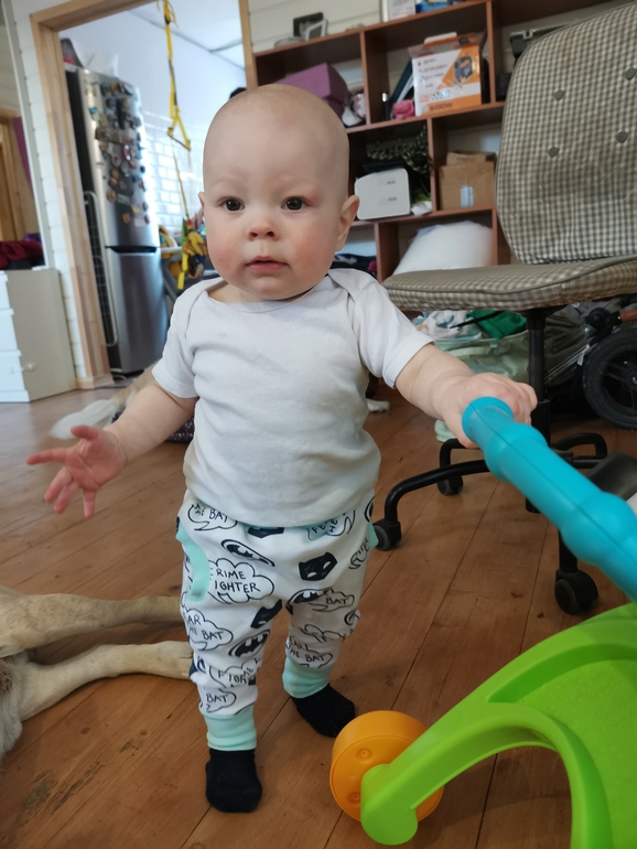 Умелки: ползает как электровеник, перелезает через собак, диванные подушки и другие предметы, встаёт с минимальной опорой (например, у холодильника, и тырит магниты), ходит у опоры, ходит с тележкой, ходит со стульями. Танцует. Осваивает звукоподражания. Рычит вместе с собаками, орёт вместе с кухонным комбайном. Слоги баба и бубу. Раньше больше слогов было, видно, неинтересно. Хлопает в ладошки. В ванной купается без сидения, сидит там, брызгается, ползает, встаёт. Нравится ему.