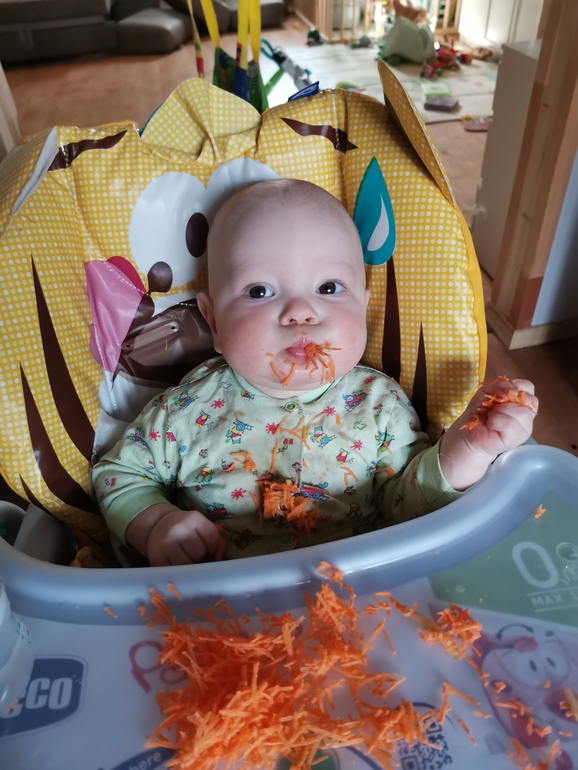 На обед из пароварки - мясо (индейка/кролик/говядина) + овощи (в основном из заморозки морковка, тыква, брокколи, цв капуста). Где-то 1/3 овощей перемалываю в пюре с мясом, 2/3 ест руками сам. Под конец даю тертую на мелкой тёрке морковку или яблоко. Но от того, что ест руками сам, ему попадает, наверное 1/4я🙈 Но мальчик очень старается.