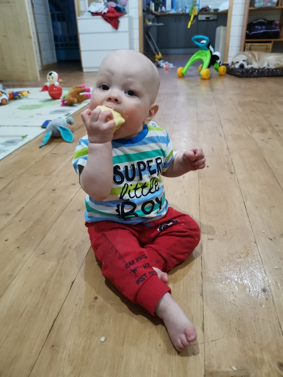Помимо разрушения дома второй его интерес - это прикорм. Грудь не очень уже интересует, а вот еда - очень. Готов пробовать все, что дают. Ест хорошо. Умеет многое есть сам. Особо сильно любит фрукты (свежие груши, мандарины), тыкву, мясо, печеньки. На днях ввела творожок с утра.