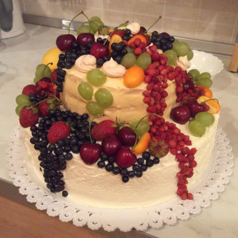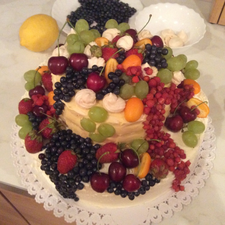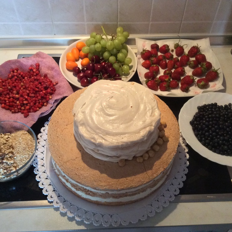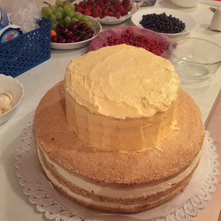У меня корж из двух порций. Разрезаю на три части. Мои не любят когда сильно сладко - пропитываю водой. Примерно 3-5 ложек на слой. Потом кладу пару ложек крема, распределяю равномерно и сыплю ягоду, сверну снова крем. И так далее. Сверху обычно всё закрываю ганашем, но сын не любит шоколад, по этому сегодня так.