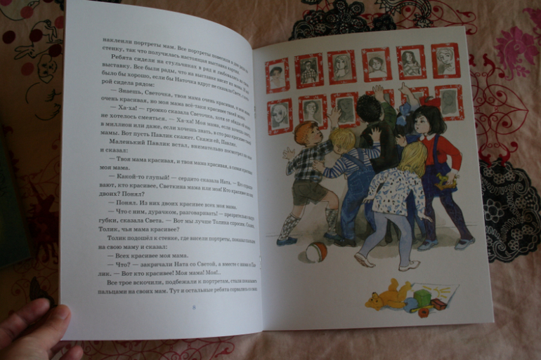 Небольшой рассказ о детях в садике, которые готовятся к празднику 8 марта и хотят порадовать своих мам необычной выставкой. Им надо каждому взять у своей мамы по фотокарточке и принести в садик. В садике перед праздником дети делают рамочки и вещают в ряд фотографии мам на стену. Тут у них начинается спор у кого самая красивая мама. Конечно же каждый ребенок, утверждает что его мама самая красивая. Тут в помещение входит воспитательница и чтобы решить конфликт, предлагает мальчику, который сидел тихо в уголке и в споре не участвовал выбрать самую красивую маму, ей они на празднике всей группой вручат букет. Тут встает мальчик и говорит что самая красивая его бабушка. Дети немножко спорят, но в итоге все соглашаются вручить букет ей, так как среди всех мам она самая старшая.