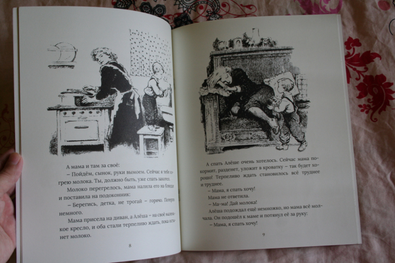 Если честно сюжет показался немного сюрреалистичным. Мне не очень верится что малыш смог сам подставить стул к подоконнику, выпить молоко из блюдца, налить в стакан воды из графина и ничего не разбить. Также в истории описывается, что маленький ребенок сам разделся (снял лифчик и ботинки на шнурках), сам выключил свет, закрыл пледом усталую и уснувшую на диване маму, сам залез в свою кровать и уснул. Я бы больше поверила, что он бы разбудил маму или расплакался от голода, так как мама обещала его покормить, и пока ждала, когда остынет молоко, уснула на диване. Но если воспринимать эту историю не как реальные события, а как некую добрую сказку, тогда все ок.