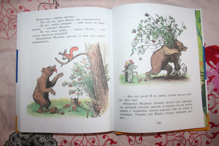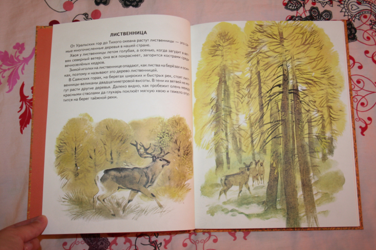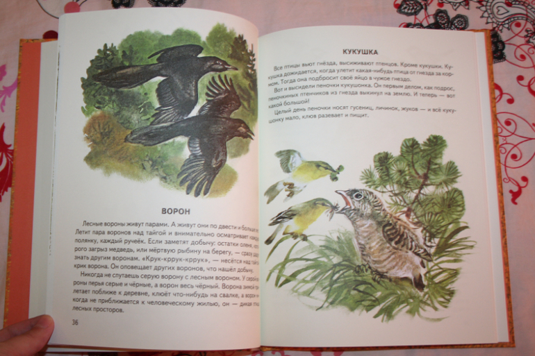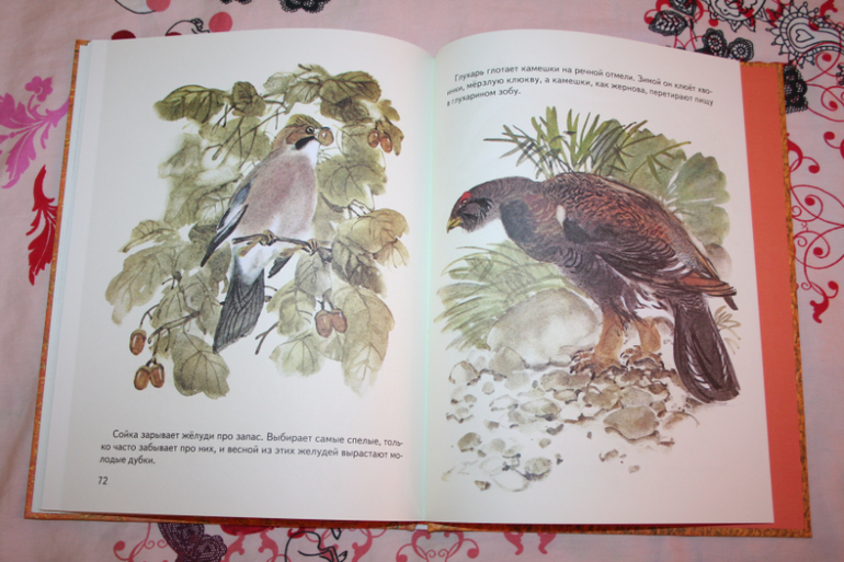 Книга разделена на несколько частей - деревья (раздел деревья чем то напомнил книгу Русский лес Мамина - Сибиряка с илл Никольского), животные, птицы, первое солнышко (раздел о детенышах), раздел о том, как животные маскируются на местности и раздел о том, как животные и птицы к зиме готовятся. Всего 80 страниц хорошего латвийского офсета. Маркировка 0 плюс, мне кажется данная книга будет интересна детям от 3 до 9 - 10 лет. Мы читали и с дочкой 3 лет, и с сыном 5 лет, сын слушал лучше, с ним можно пообсуждать повадки животных, что то дополнить самой, рассказать подробнее, задать вопросы по тексту и тп. Есть что пообсуждать после прочтения, иначе говоря. Сын сказал, что книга интересная. Дочитали до конца. Правда первую часть про деревья слушал в пол уха. Про животных лучше пошло. А дочке пока это не так интересно. Видимо еще рановато.