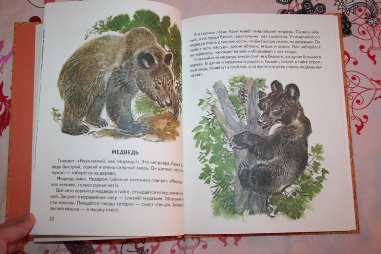 Для себя из этой книги тоже подчерпнула интересные факты, к примеру, что гималайский медведь живет в дуплах деревьев, и когда большой кедр спилят и привезут в деревню или селение, внутри из него может вылезти медведь. Кстати медвежата также рождаются в дуплах деревьев. Или еще к примеру, лиса любит выживать из нор барсуков, заберется в отнорок к барсуку и живет, а барсук брезгливый, пофыркает, потерпит и уходит, оставляет нору лисе. А еще про Вальдшнепа есть небольшая заметка, я лично про эту птицу вообще ничего не знала и слабо представляла, как она выглядит, думала это куропатка, а она оказалась похожей на кулика. Я помню, когда читала Белый Бим, Черное ухо, а было это совсем недавно, все пыталась себе представить, как же выглядит Вальдшнеп, он там встречается в главах про охоту. Загуглить было лень тогда. Теперь вот узнала.