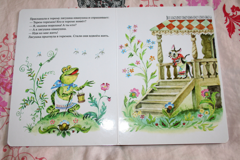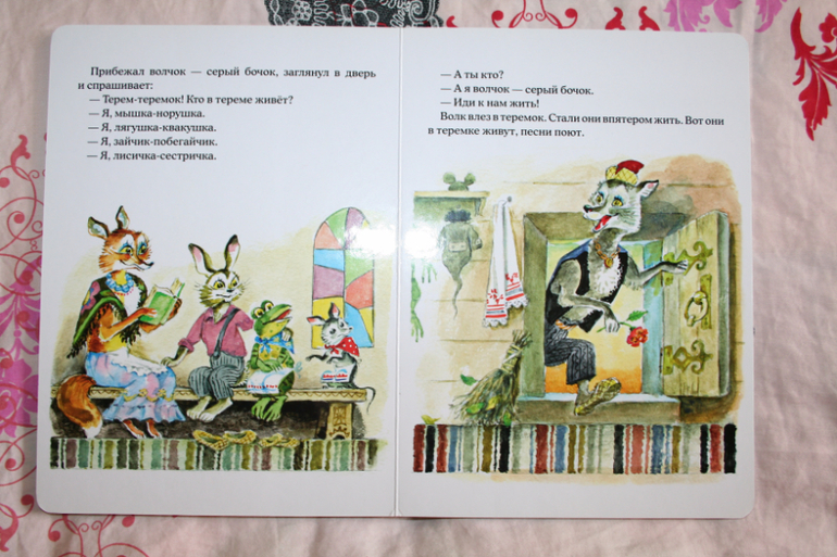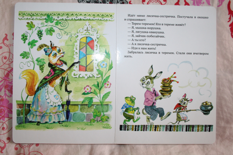 Вот где я люблю илл Елисеева больше всего, так это в этой книге. Нигде мне больше не нравятся илл Елисеева как в Теремке. Уж не знаю почему, но мила мне эта кокетливая лиса в платочке на плечах, нравится этот подозрительно моднявый волк, да и хозяйственная мышка располагает к себе с первого взгляда. Содержание Теремка думаю известно всем, про картонку можно сказать, что она отпечатана в Китае, вполне приличном качестве. Картонные странички ламинированные и блестят. Меня это особо не раздражает. Детям книга нравится. Да и прочная она, для первого знакомства хорошо подходит, не развалится. Из этой серии у нас еще Плетень и Николенька - Гусачок.