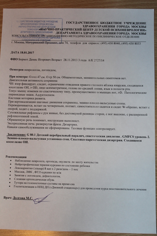 1. Выписка из НПЦ ДПН от 18.01.2017 г. подтверждающая наш диагноз.