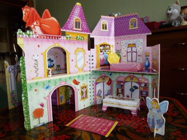 Книга трансформируется в уютный двухэтажный домик с верандой, каруселями, садом и кованными воротами. Кроме того, в ней спрятаны сказочные феи и целый набор вырезалок, раскрасок и многоразовых наклеек.