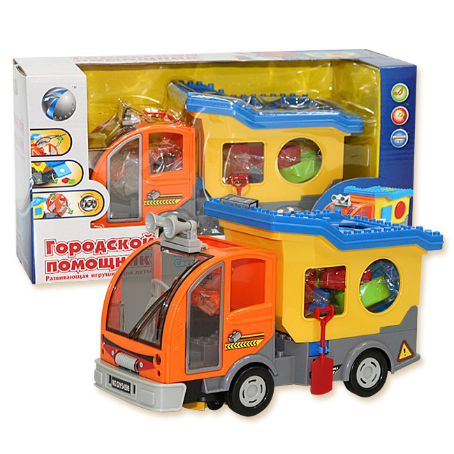 В комплекте к "Городскому помощнику" идут 2 съемные трубы, метёлка и лопата, которые могут как крепиться к кузову автомобиля, так и вставляться в руки игрушке. Сверху на игрушку можно установить маленький импровизированный громкоговоритель. Машина очень хорошего качества, оснащена световыми и звуковыми эффектами.