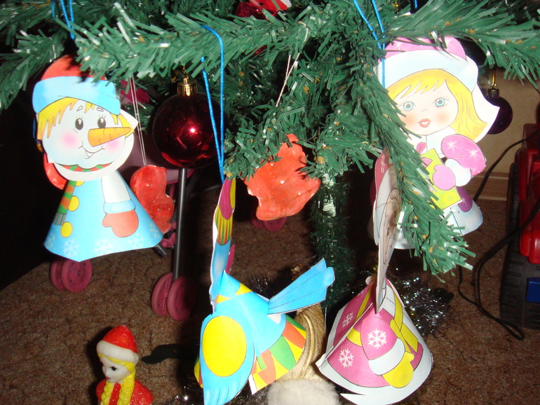 А нам Дед Мороз подарил парочку интересных книжечек. Вчера мастерили игрушки на елку. Все просто, Лиза вырезала крупные детали для конуса, я мелкие. Потом вместе клеили. Вот такая красота у нас получилась.