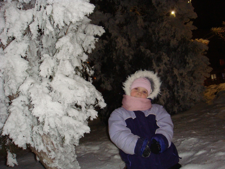 Красиво у нас сейчас. Деревья все в снегу. А вечером, когда зажигаются огоньки, становится как в сказке.