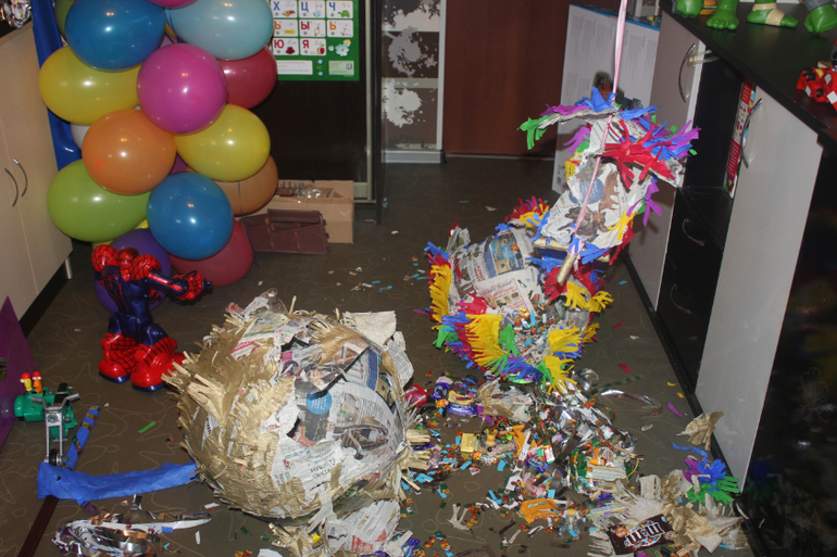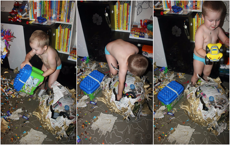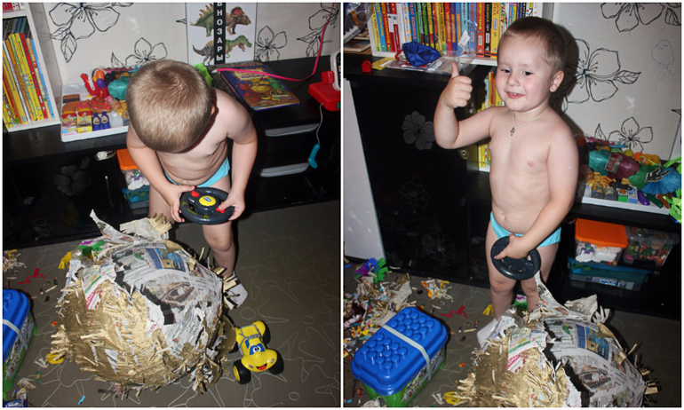 Эта пиньята у меня прям такая добротная получилась,так что пришлось Темику маму на помощь звать)) Да еще места в доме куда ее повесить совсем не нашлось((пришлось вешать на ручку дверцы.Эффект конечно не такой,потому что весела низко((но главное ,что ребенку все равно понравилось! Долго он потом их вспоминал и всем рассказывал))