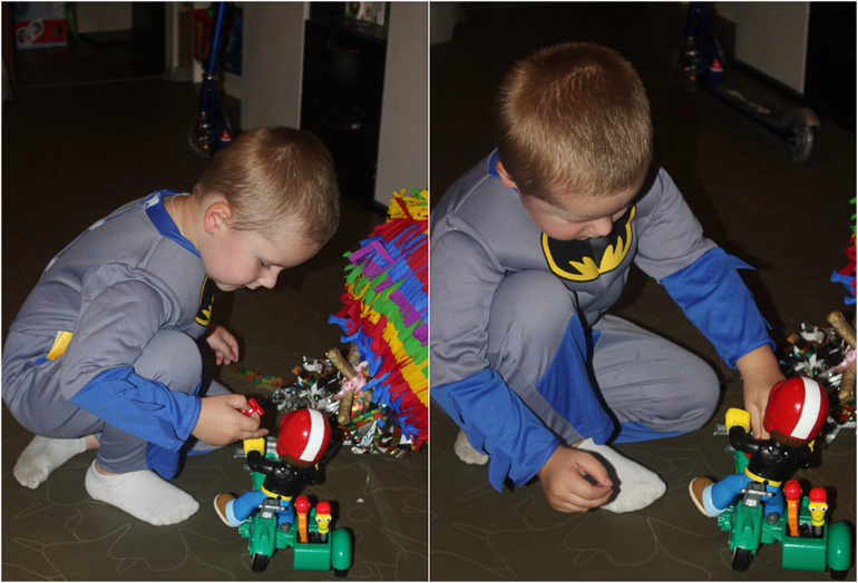 На видео видно,что первым делом он обрадовался фигуркам "Ниндзя,Ниндзя"- повторял Темик))У нас есть наборы где человечки такие,они ему очень нравятся,поэтому когда он увидел одного,накинулся и принялся выискивать остальных,а уж потом и за сладости взялся)) Он у нас еще тот сладкоежка,но меру знает)