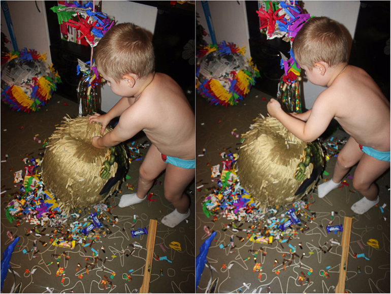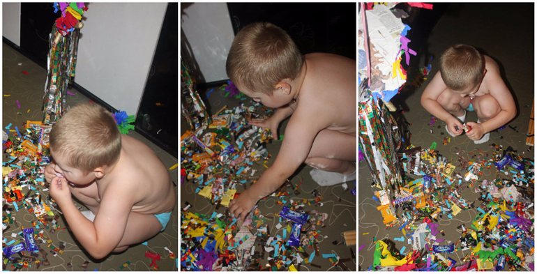 Вернувшись домой после Аквапарка,Темика поджидали еще подарочки и пиньяты.Подарок затмили пеньяты))с них Темик и начал)
