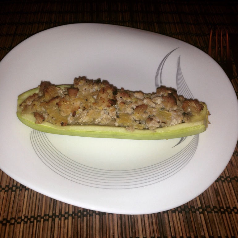 Получившуюся смесь выкладываем в "лодочки" из кабачков и отправляем их в духовку, разогретую до 170 градусов примерно на 30 минут. О готовности блюда можно судить по мягкости кабачков. Лично я люблю, когда они слегка твёрдые. Под конец приготовления можео посыпать тертым сыром.
