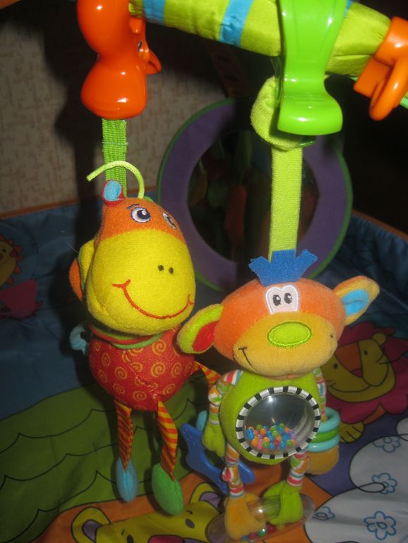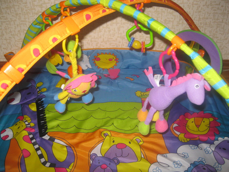 Развивающий коврик Tiny Love Зоосад с мягкими игрушками и развивающей игрой понравится детям и взрослым. Три забавные погремушки, прорезыватель для детских зубов - все выполнено из безопасных материалов. Данный коврик c зеркалом, которое крепится на липучках. Для интереса ребенка имеется увлекательная игра на центре: при ударе ножками или руками играет музыка. Все элементы можно снять, и получится мягкий развивающий коврик с веселыми картинками.