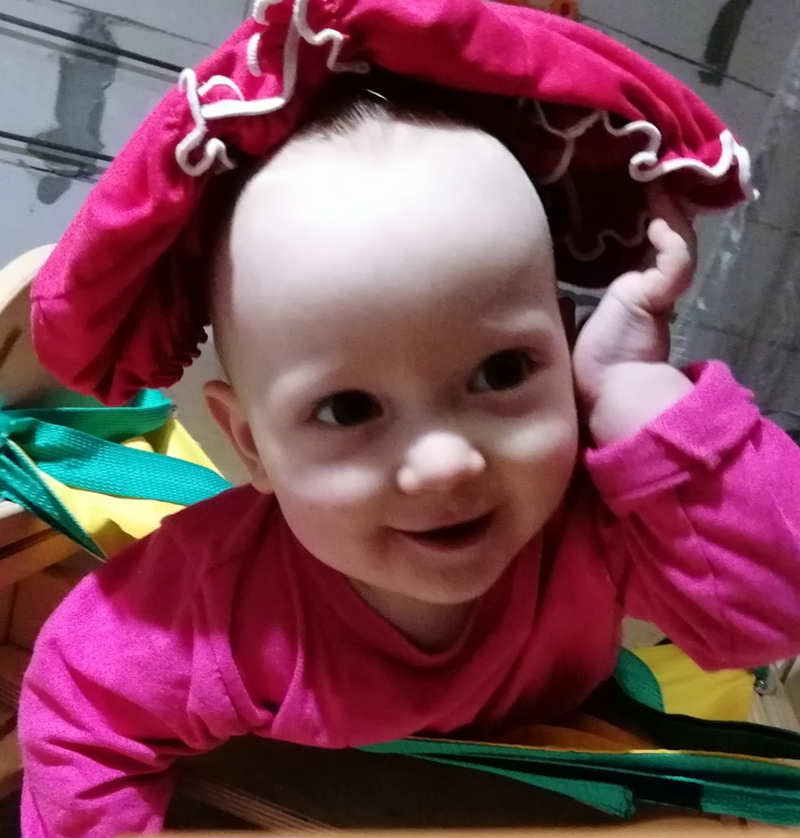 На фото еще училась ползать, со шляпкой (шортиками) на голове. С опорой для ползания. Модница моя:)