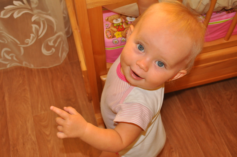 В этом месяце Машенька стала сама вставать в коляске, ходить у опоры (стол, кровать,диван), говорит на кошку "ксь", сама чешет десну там, где лезет зубик.
