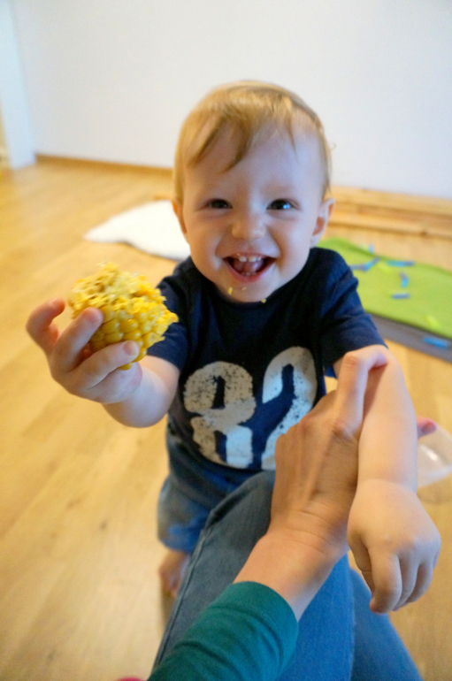 Учится есть как взрослый - приборами (учится, но еще ни разу не умеет), ему очень нравится держать самому взрослую вилку/ложку и ковырять ими в моей тарелке, или в своей (куда дотянется).