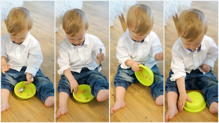 Взрослую еду иногда ест сам - и хотя это ужас-ужасный, я позволяю и поощряю. Как-то же надо учится)