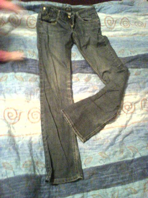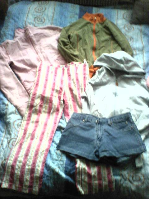 Джинсы светло голубые расклешенные 42 размер; блузка 3/4 рукав(немного желтых пятен есть на воротнике, возможно отстирается). Штаны спортивные с поясом, кофты из "твоё", бриждиполосатые, шортики джинсовые, теплые кофты(50 и 100% шерсть). Жилетка ярко зеленая.